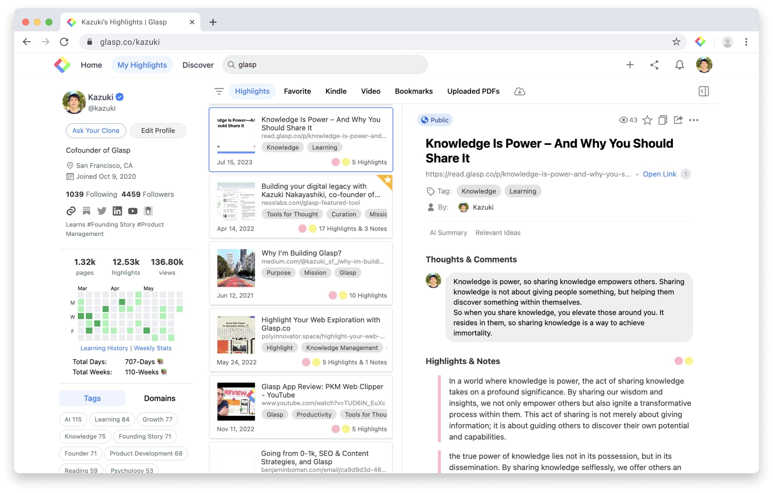 Glasp is a knowledge management platform with a unique social twist. We aim to enable users to capture and share valuable insights from the internet. By allowing users to highlight and annotate content, we help them curate information that resonates with them. This not only saves time but also builds a community where users can discover and learn from each other's curated content. Our mission is to democratize access to knowledge, making it easier for everyone to benefit from shared learning and insights. What I love most about working at Glasp is the impact we have on our users' lives. Knowing that we are building a tool that helps people find, organize, and share important information is incredibly fulfilling. It's exciting to see the positive feedback from our users and to know that we're making a difference in how people learn and connect.