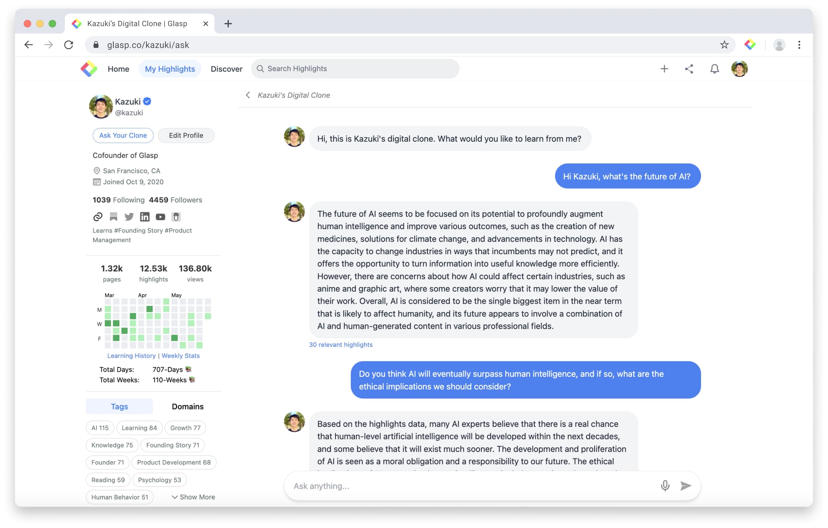 Glasp offers browser extensions and an iOS app that enable users to highlight, annotate, and summarize content they find online. AI plays a crucial role in enhancing these functionalities. For instance, AI helps in summarizing the content that users highlight, making it easier to digest and share. Our AI-driven features include finding similar ideas and creating personalized digital clones that can interact with users based on their saved information. These AI clones can answer questions and provide insights, creating a more interactive and personalized learning experience.