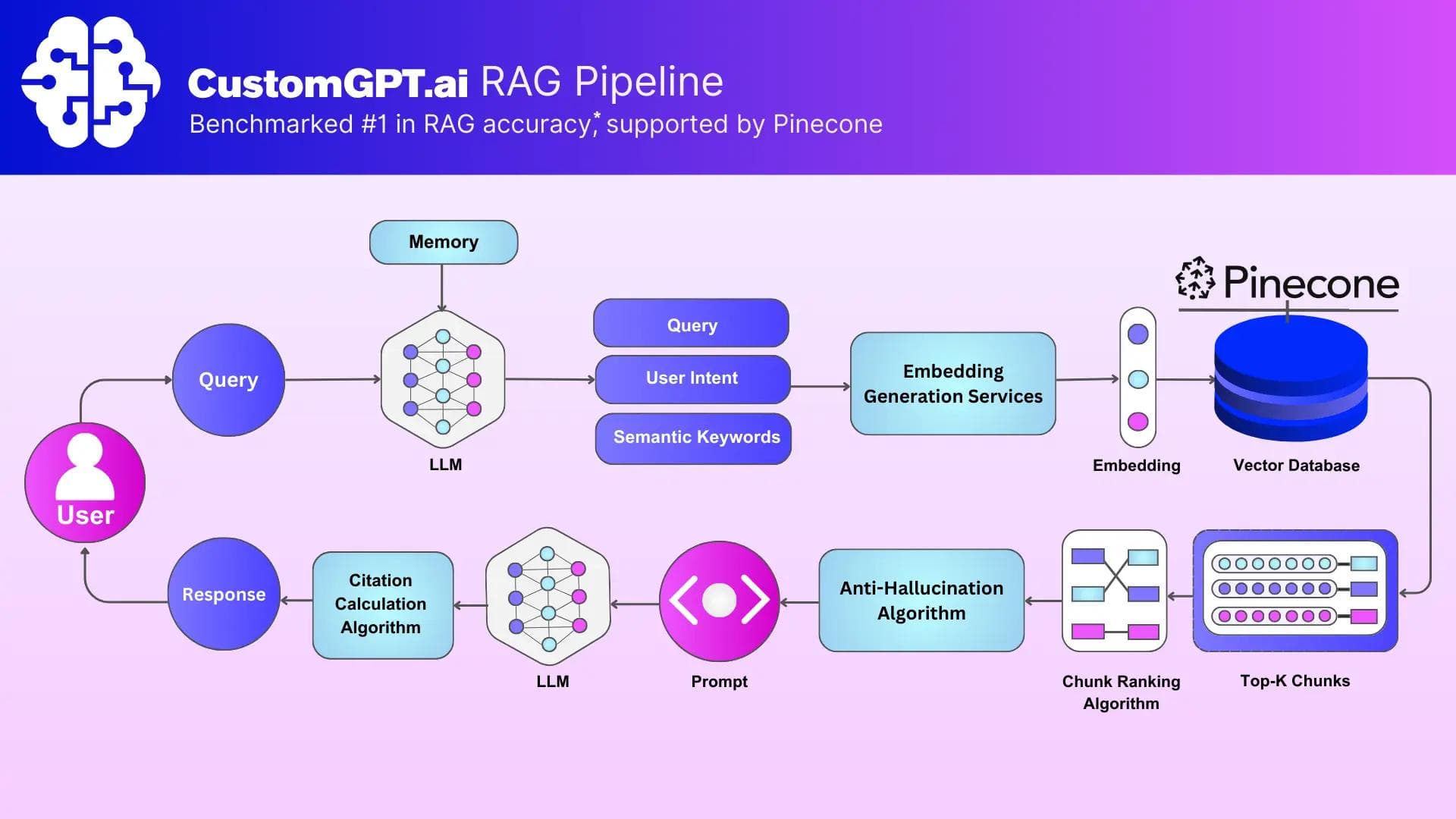 By offloading vector retrieval to Pinecone, CustomGPT.ai was able to focus entirely on building the differentiated components of their platform—from intuitive user-facing tools to fine-tuned LLM workflows.