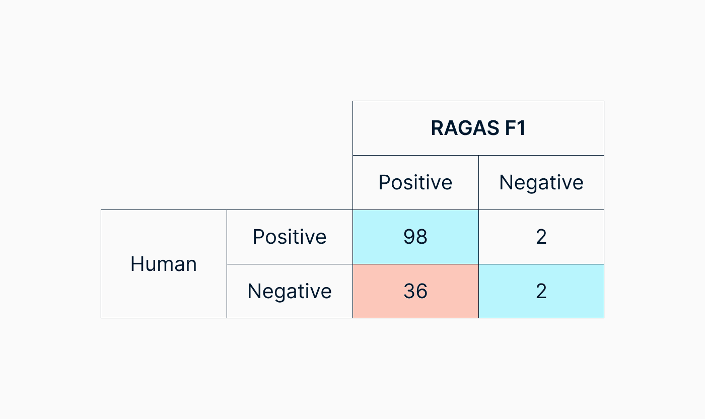 For example, when comparing the RAGAS evaluation library on FinanceBench, we get a false-positive rate of 0.94 (lower is better). This approach means the metric does not always capture hallucination.