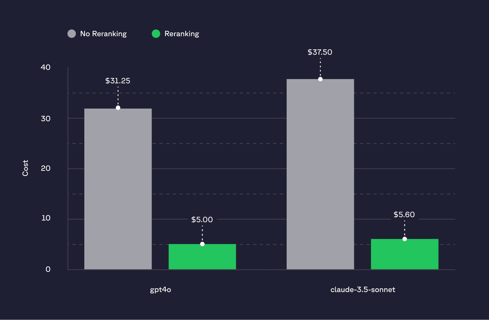 Despite the rapid decline in LLM costs over the past year, the expense of productionizing a pipeline can still be significant. Input tokens from the context passed to the LLM often drive up costs, even when they contribute little or no essential content for generation. Pinecone’s rerankers can reduce these costs by 85% when used with gpt4-o.