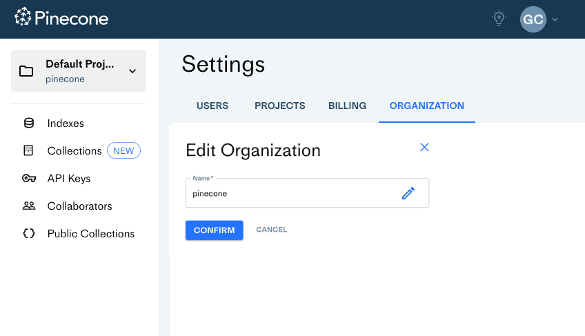 Prior to organizations, projects and billing within Pinecone could only be owned and managed by a single user. But when responsibilities change, you may want more than one user to manage projects and billing so operations continue to run smoothly. Or as new projects arise, you may want additional users to make contributions or test out a new application.