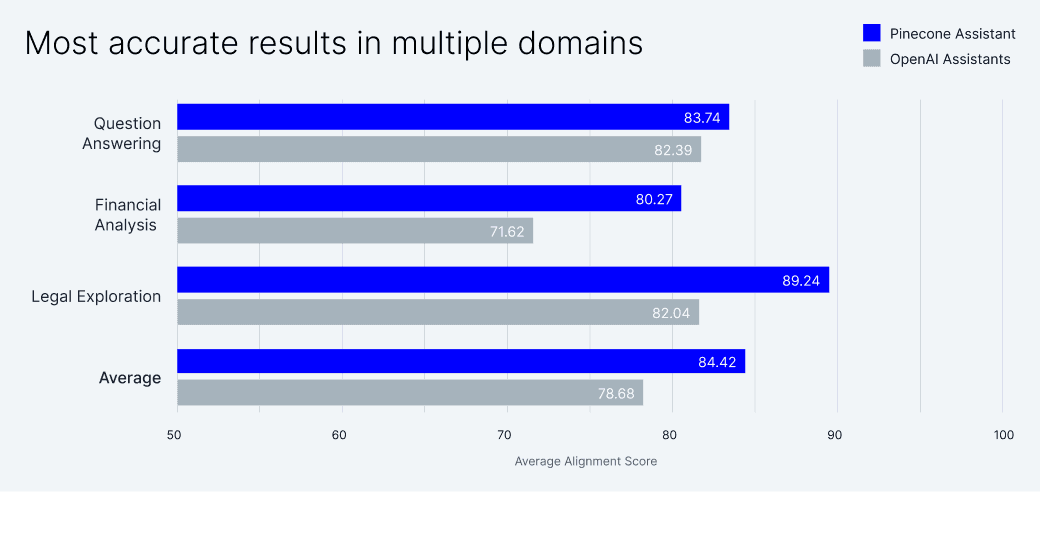 Our research on RAG shows that you can dramatically improve the performance of LLMs on many tasks by leveraging a vector database like Pinecone Serverless that’s capable of efficiently storing and searching across billions of embeddings. Pinecone Assistant leverages Serverless to retrieve only the most relevant documents to formulate a coherent context, enabling the LLM to generate the most accurate results across domains. Our initial benchmarking efforts show that Pinecone Assistant performs better than other assistant APIs (e.g., OpenAI Assistants).