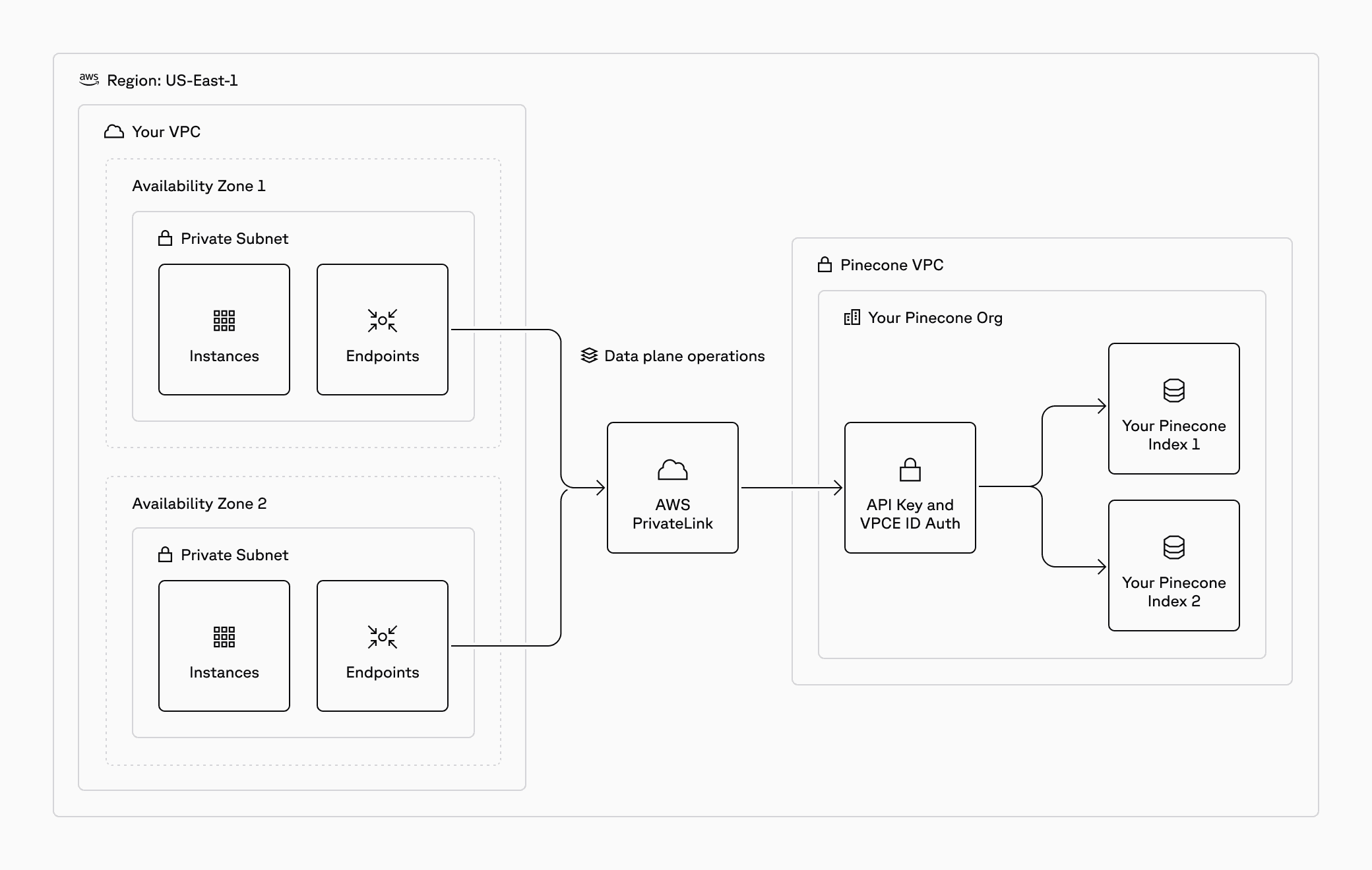 In addition to encryption at rest and in transit, Private Endpoints provides additional security by ensuring that your data traffic traverses the AWS network without public internet exposure. Private Endpoints also reduce the risk of exposing your VPC resources to the Internet (or other outside networks) through a misconfiguration, and minimize the risk of unauthorized access to your Pinecone indexes.