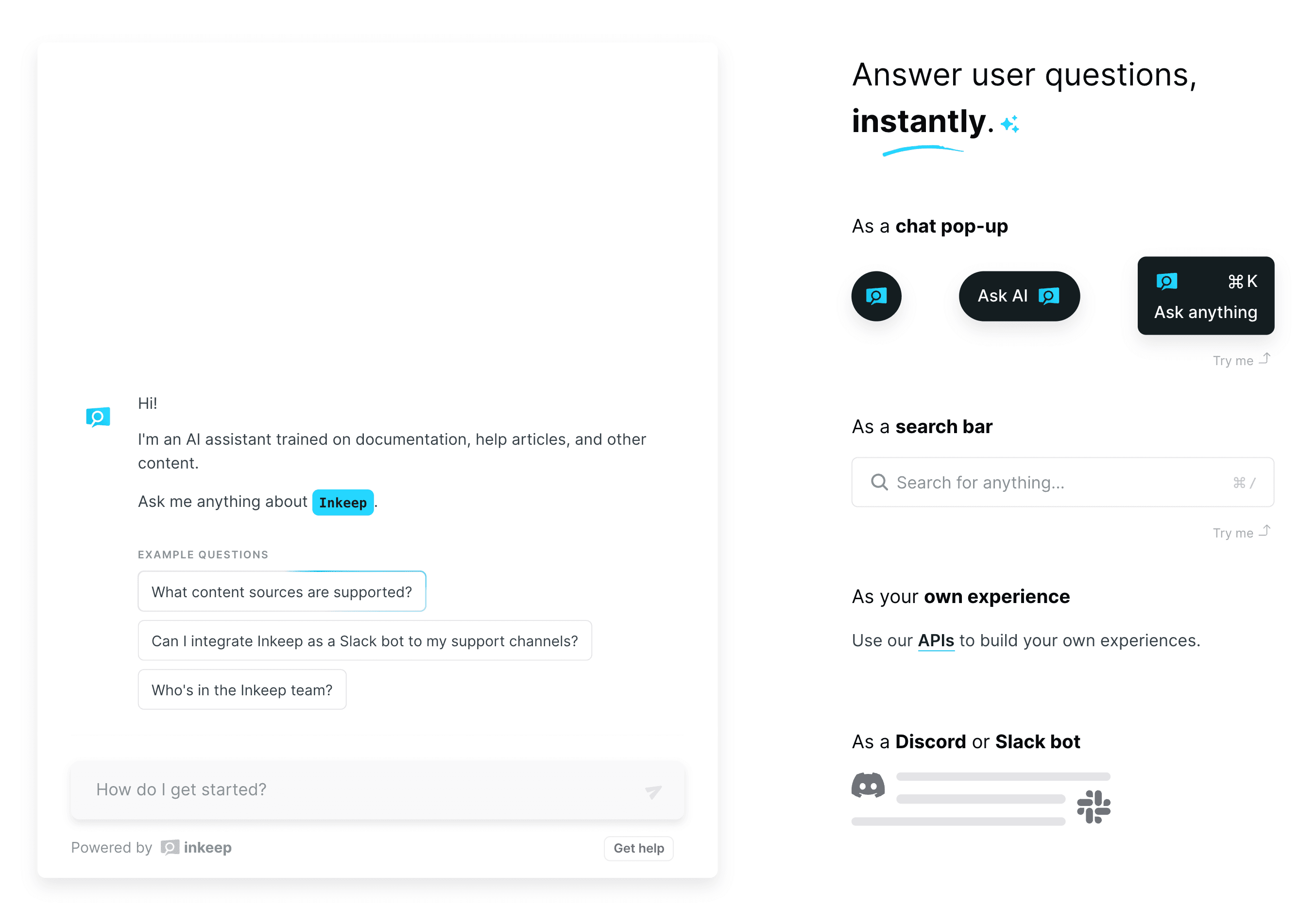 Inkeep differentiates itself by offering a completely hands-free solution that maintains a very high bar for quality of answers. Our platform can automatically ingest content from any source—whether it’s documentation, support tickets, or forums—without requiring engineering teams to invest time and resources. We offer simple, embeddable UI components like search bars and chatbots for Slack or Discord, allowing companies to seamlessly integrate Inkeep wherever they interact with their users.