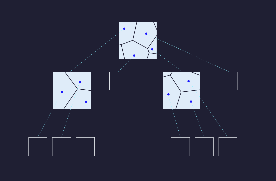 Therefore, the index builder maintains a hierarchy of partitions starting from coarse-grained to more refined as it sees more data. This process allows the index to be incrementally maintained and stay efficient for search as data evolves.
