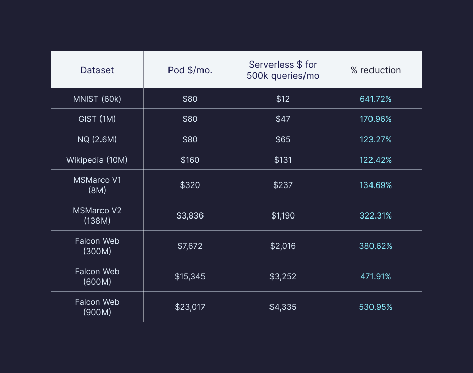 Here, we benchmarked what it costs to serve queries on the pod-based architecture vs Pinecone serverless across various datasets, keeping recall at least as high as the pod-based architecture.