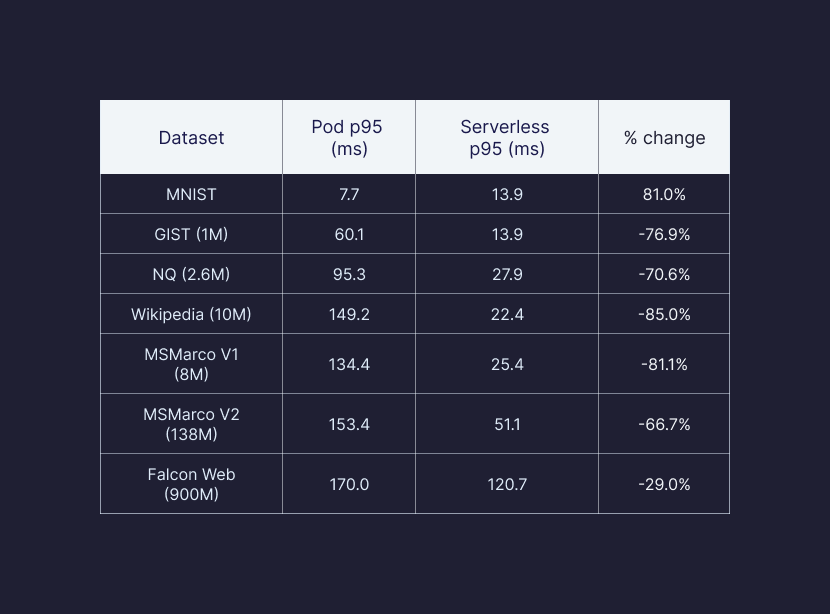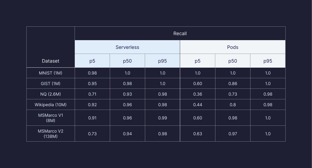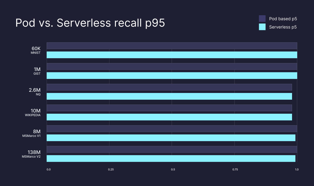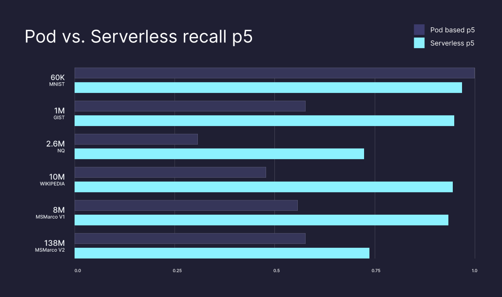 Our best gains came from improving many of our âworst caseâ recall performances. At p95 (the majority of calls), Serverless and pod-based return similar recall performance, but our worse-case performances (p50 and p5) are significantly improved.