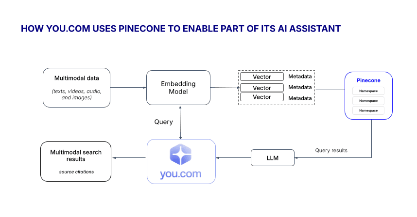 - Highly scalable: Pinecone enables you.com to handle hundreds of millions of vectors simultaneously, acting as a long-term memory needed for scalability and contextual enrichment to their dataset.