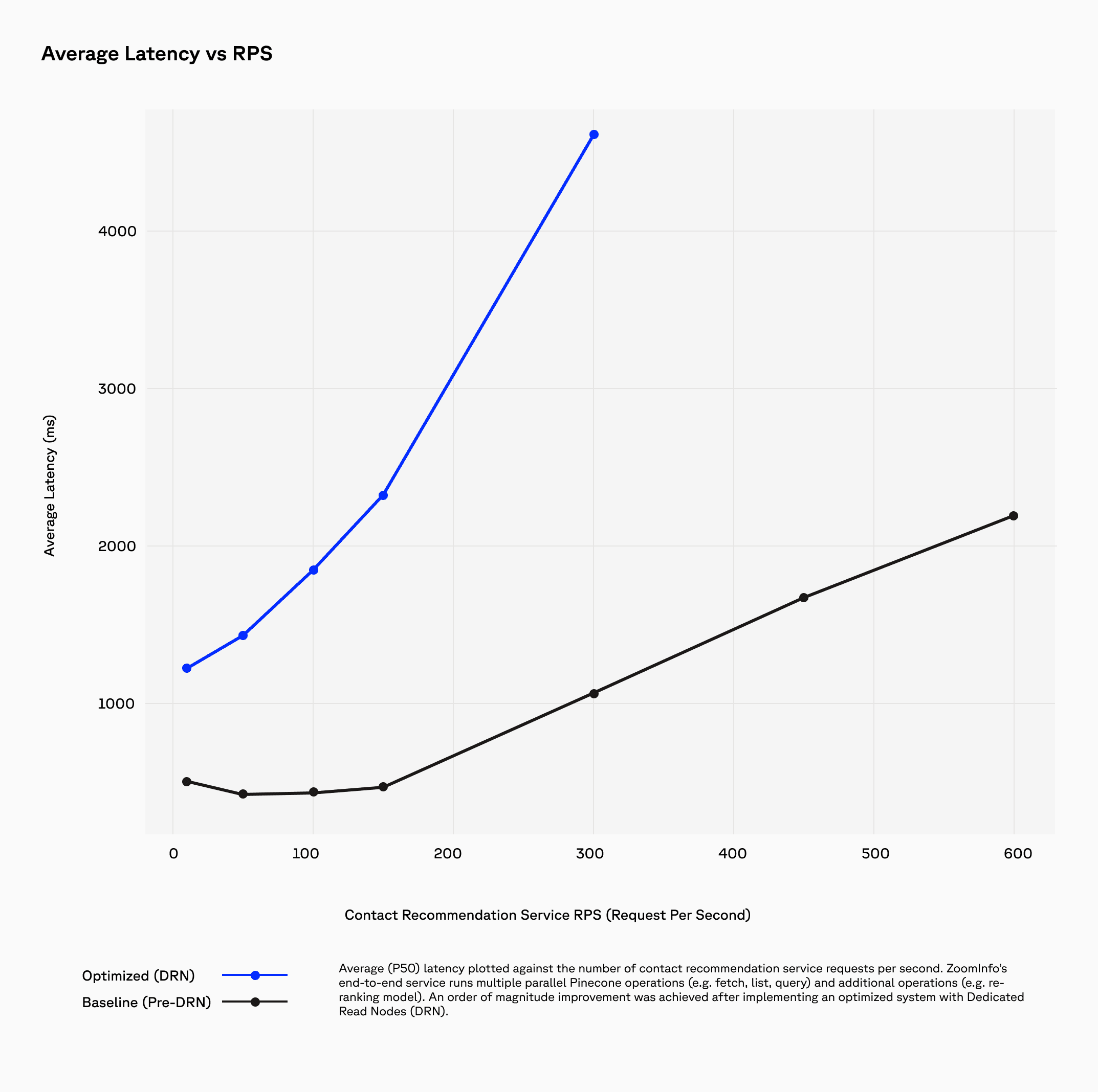 Pinecone’s asynchronous operations, serverless design, slab-based storage, and Dedicated Read Nodes also provided the throughput and latency stability required to expand recommendations across ZoomInfo’s product suite. The system maintained predictable performance under sustained traffic while reducing the operational burden associated with managing vector infrastructure. Pinecone sustained a P50 latency of ~60ms at ~40 QPS, which helped ZoomInfo’s goal of keeping the end-to-end latency of the entire recommendation service below 1 second for lighter loads (<100 RPS), and less than 5 seconds for heavier loads (>100 RPS). This was achieved even as ZoomInfo scaled to more than 390 million vectors.