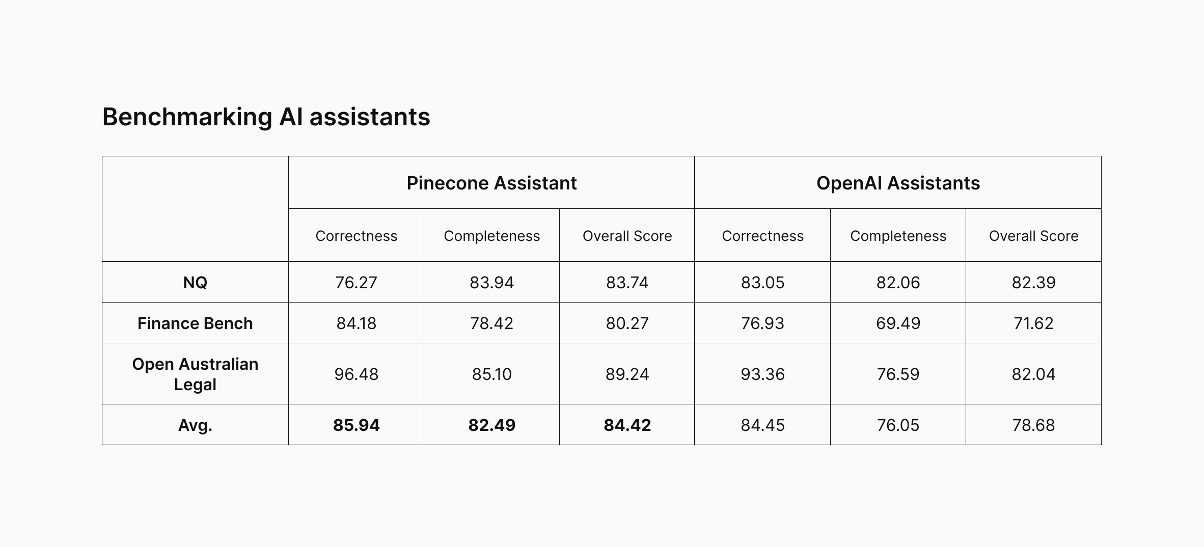 Let’s look at where existing evaluation metrics fall short, the metric we propose for evaluating AI assistants, and how Pinecone Assistant performs across three benchmark datasets.