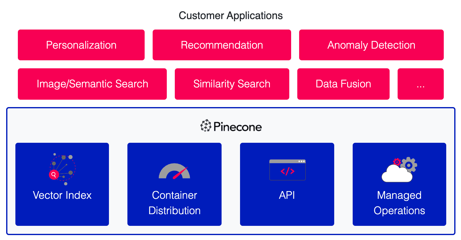 Pinecone is a managed database for working with vectors. It provides the infrastructure for ML applications that need to search and rank results based on similarity. With Pinecone, engineers and data scientists can build vector-based applications that are accurate, fast, and scalable, all with a simple API and zero maintenance.