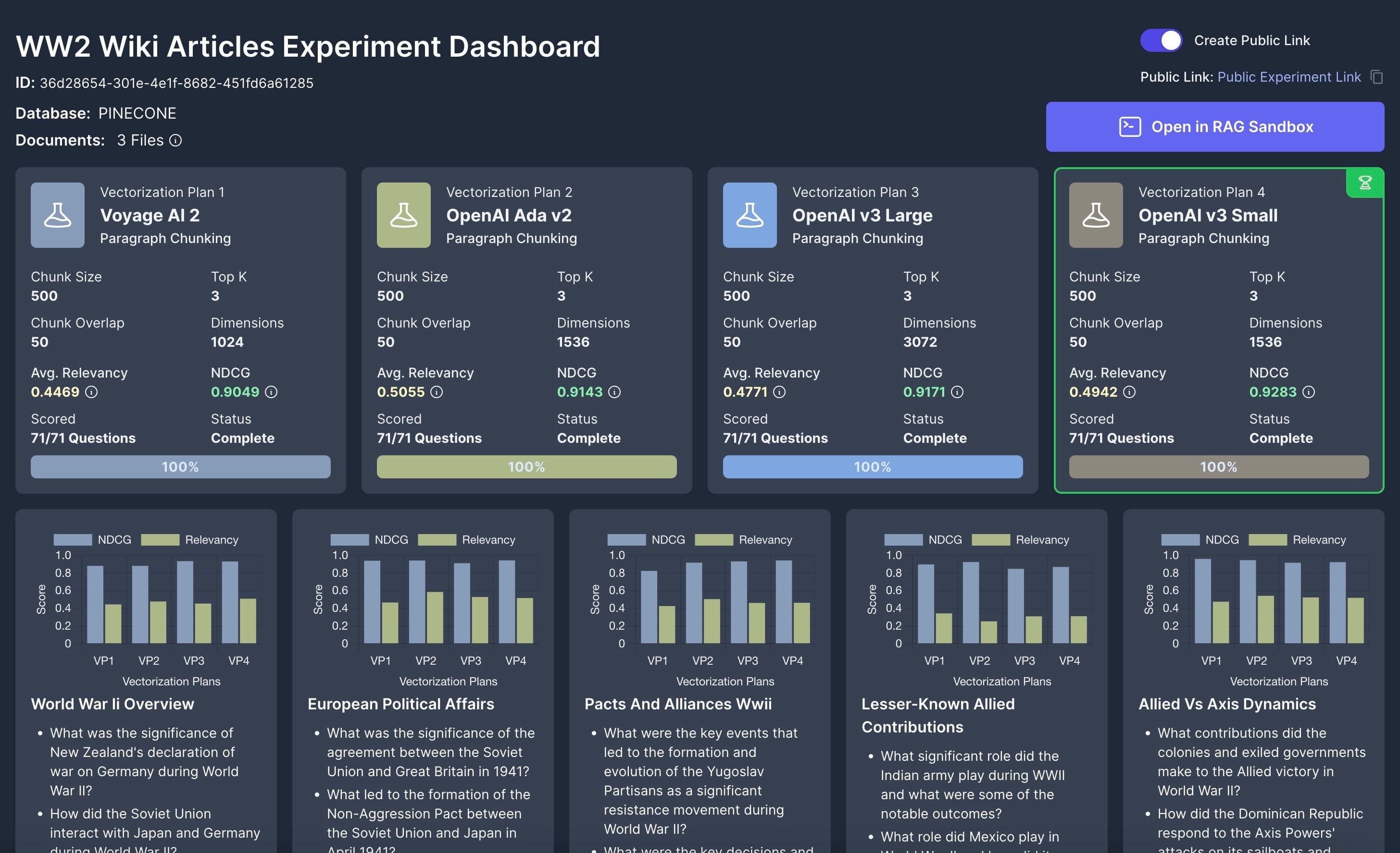 While concrete data is immensely useful, you want to verify your results with your own experience. For this, Vectorize provides a RAG Sandbox, an interactive console that lets you assess the relevance of the chunks returned from your vector database and experience how well that context integrates into an end-to-end RAG LLM workflow.
