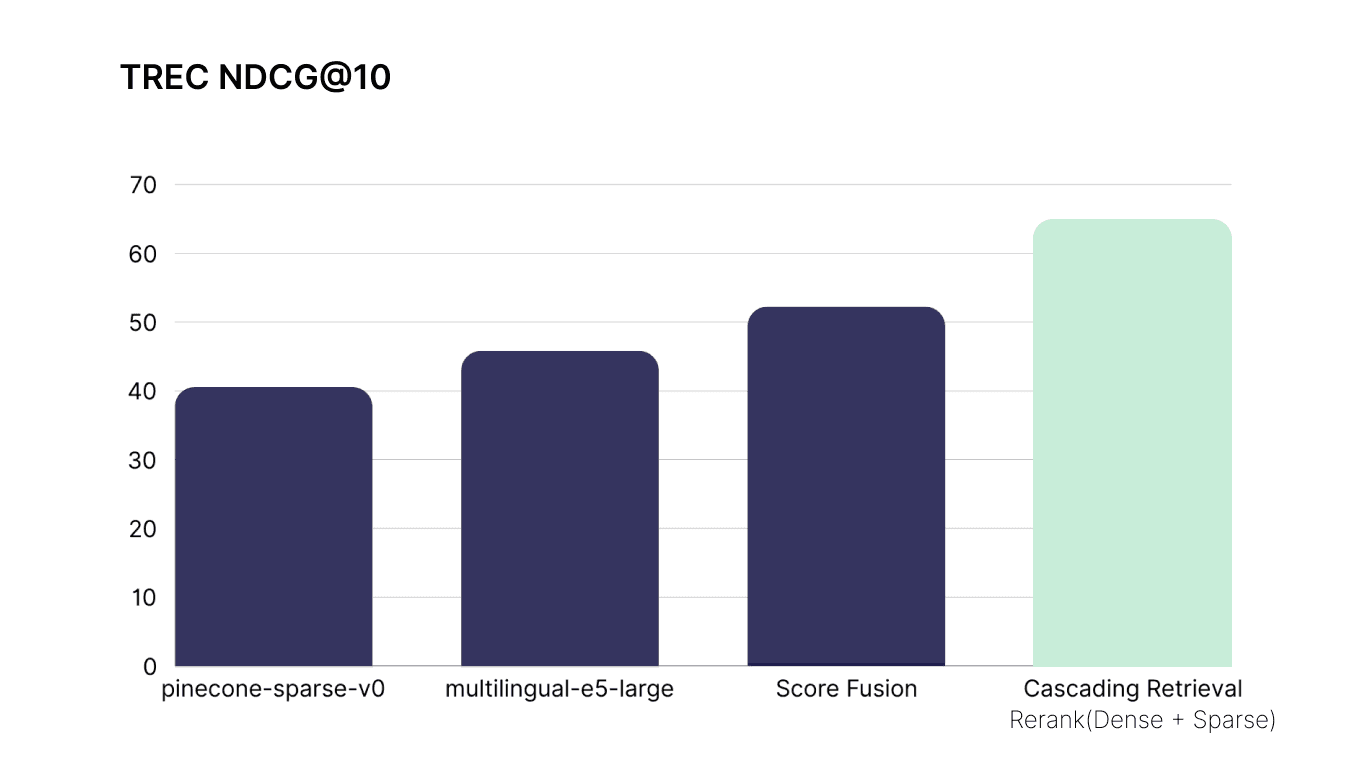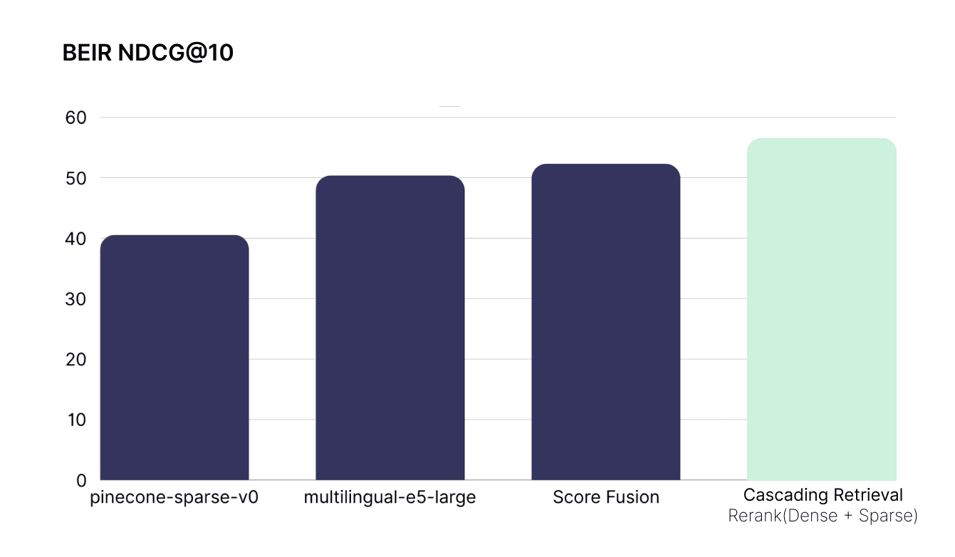 Pinecone’s new capabilities allow systems to seamlessly combine dense and sparse retrieval, enabling search utilities that capture both semantic understanding and precise keyword matches. Reranking can then be employed to refine the results by evaluating candidates from both methods and assigning a unified relevance score. This cascaded approach ensures precise, contextually relevant results in even the most complex search scenarios.