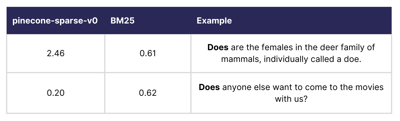 While BM25 assigns similar weights to “does” across these contexts, pinecone-sparse-english-v0 distinguishes their contextual importance, delivering more relevant results [2]. BM25 also struggles in scenarios with short texts, where term frequency lacks variation, leading to suboptimal scoring. On benchmarks, pinecone-sparse-english-v0 outperforms BM25, delivering: