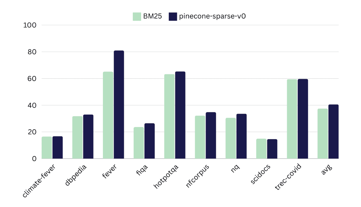 Alongside the sparse vector index type, we’re also introducing pinecone-sparse-english-v0, a sparse embedding model designed for high-precision, efficient retrieval. Fully integrated into Pinecone’s infrastructure, it streamlines the development of performant search applications with state-of-the-art sparse retrieval capabilities.