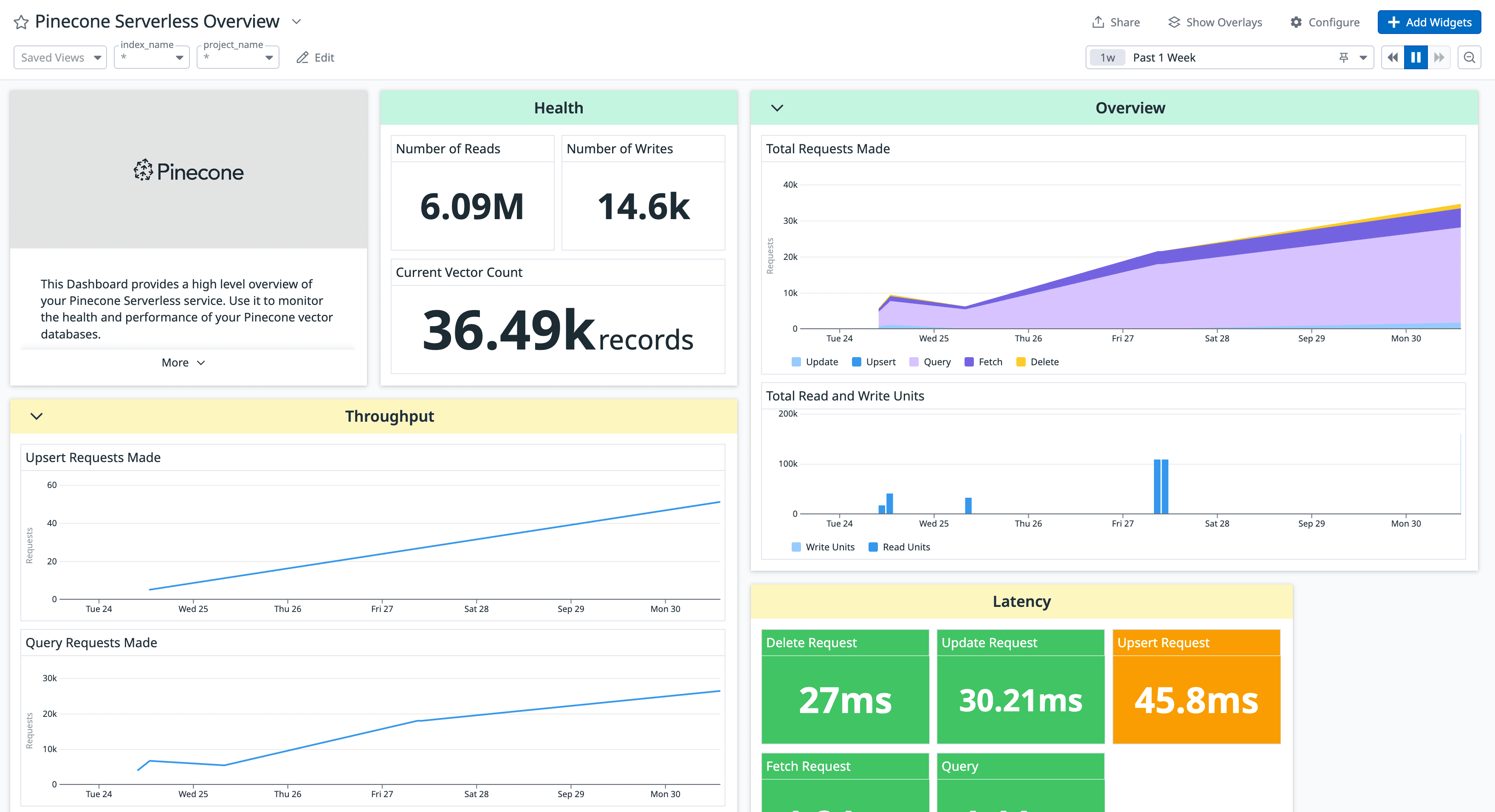 Our updated Datadog integration and new Prometheus endpoints make discovering insights into your indexes' performance and usage easier than ever. Building upon existing health metrics, you can now also monitor request frequency and duration, consumption of read and write units, and core metrics on latency through our Datadog integration or directly via our new Prometheus endpoints.