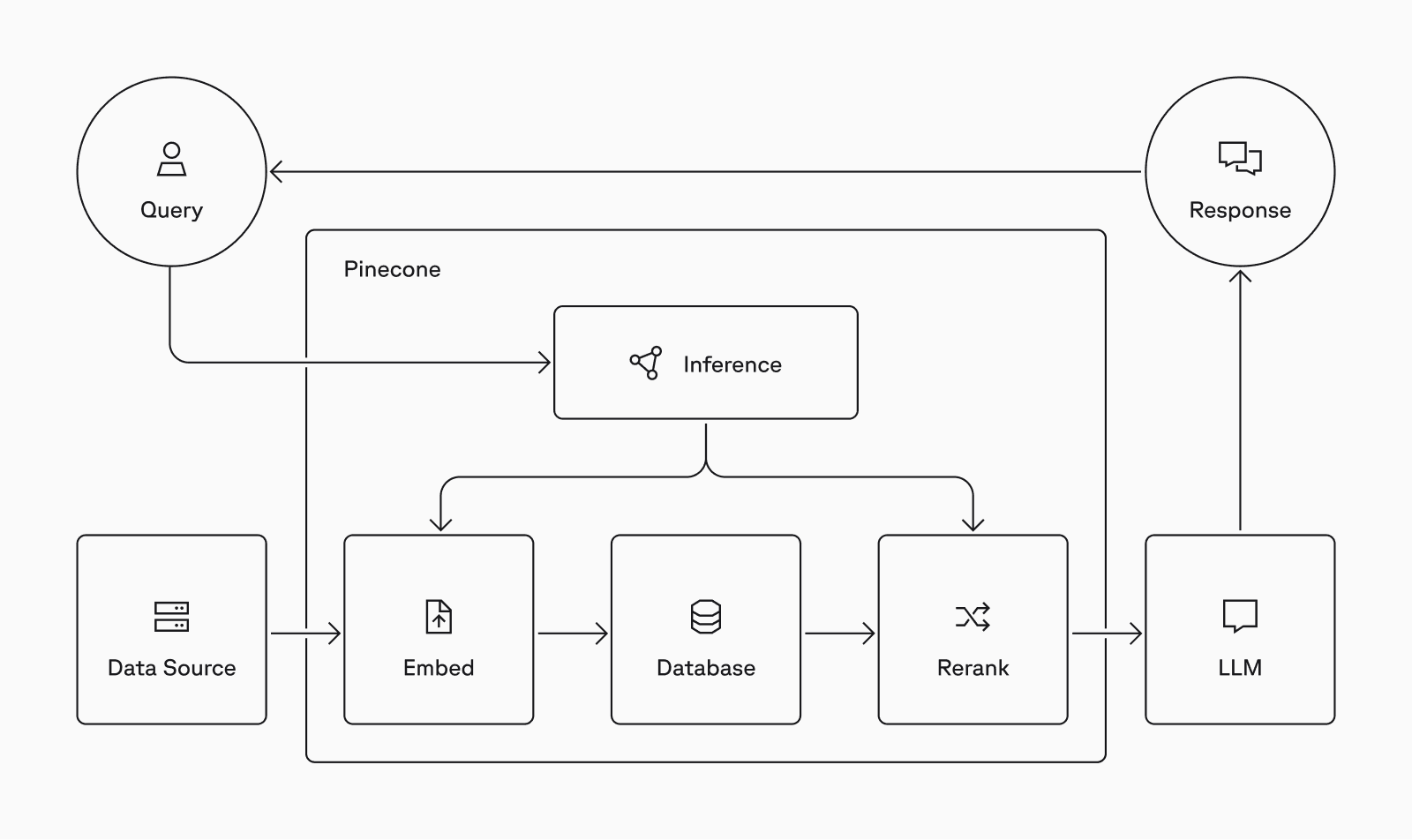Reranking capabilities are now available with Pinecone Inference, an API that provides instant access to fully-managed models hosted on Pinecone’s infrastructure. Embed, manage, query, and rerank with Pinecone via a single API to easily build accurate AI apps grounded in proprietary data faster.