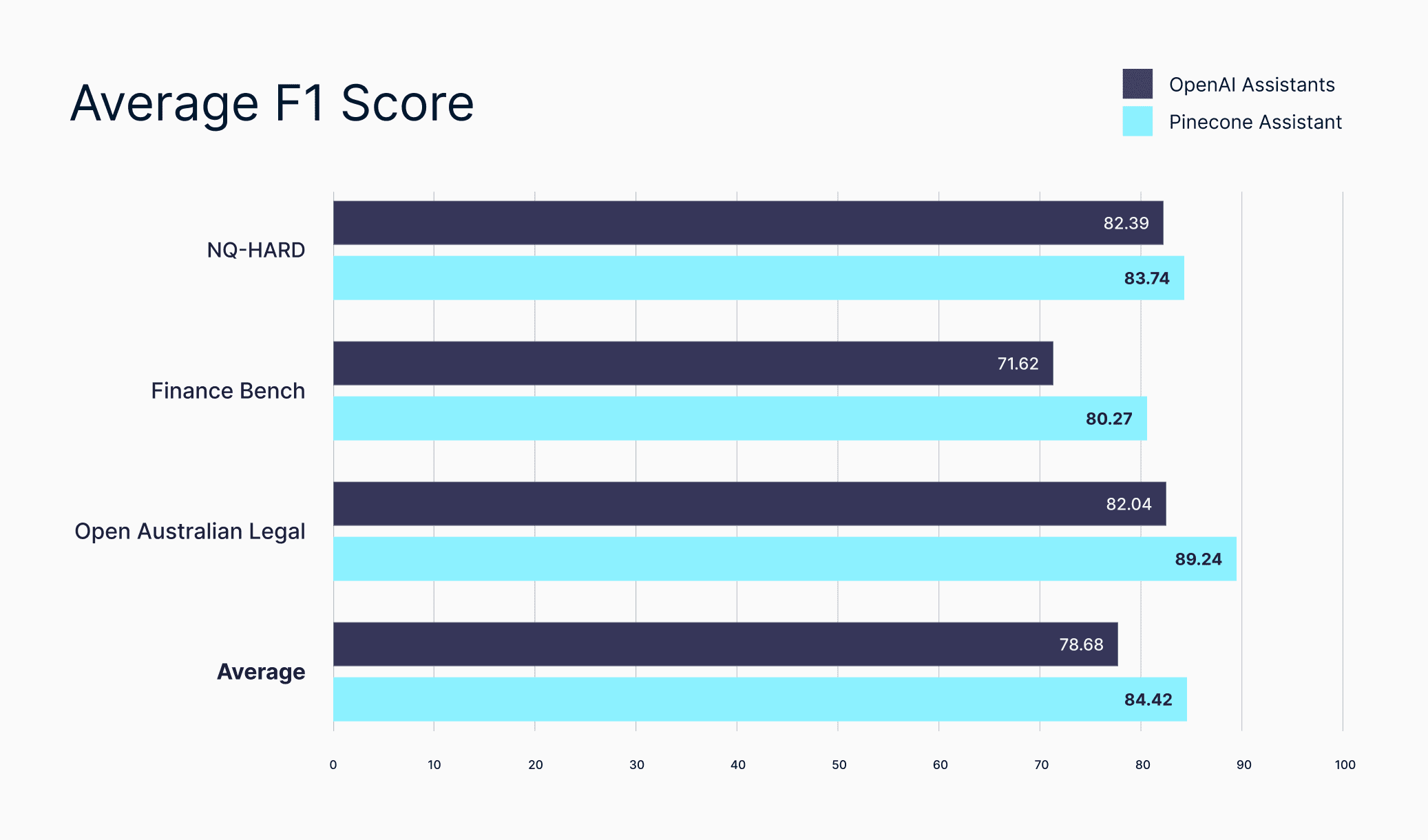 AI assistants must give accurate and reliable answers during prototyping to demonstrate value, and then in production to provide a great customer experience and minimize liabilities. That’s why we built Pinecone Assistant with a focus on delivering the highest-quality and dependable answers. Today, it already performs better than other assistant APIs for text-heavy technical data such as financial and legal documents.