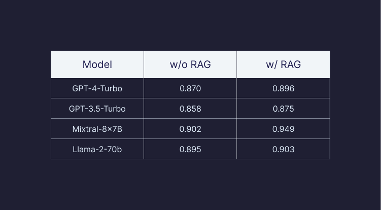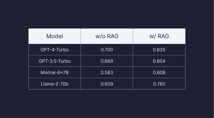 - RAG, with a lot of data, provides SOTA performance no matter what LLM you choose. This insight unlocks using different LLMs (e.g., open-source or private LLMs).