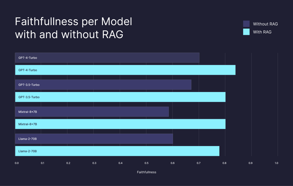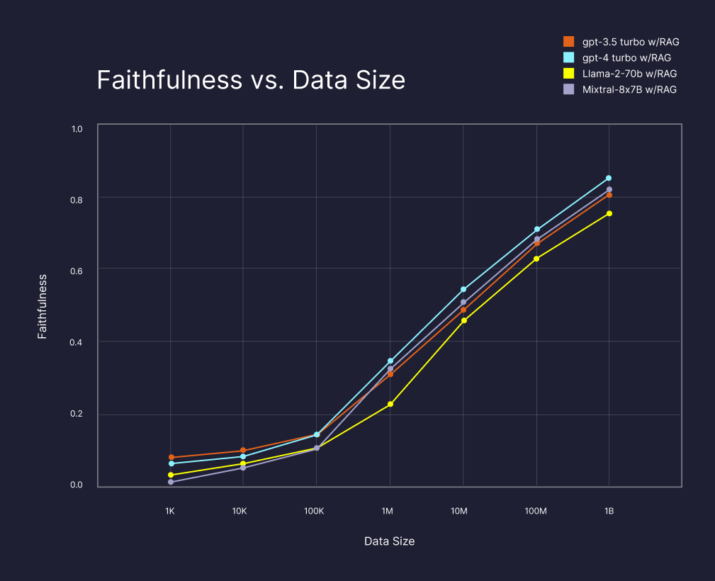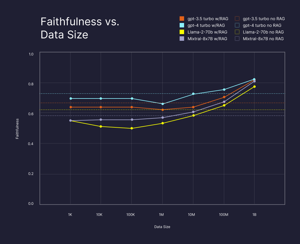 Results show that simply making more data available for context retrieval makes LLMs provide significantly better results, even when increasing the data size to 1 billion, regardless of the chosen LLM. Compared with GPT-4 alone, GPT-4 with RAG and sufficient data improved the quality of the answers significantly by 13% (reduced the frequency of unhelpful answers from GPT-4 by 50%) for the "faithfulness" metric (reference: Es at el.), even on information that the LLM was trained on; the effect would be even more significant for questions related to private data, e.g., internal company data. Additionally, results showed the same level of performance (80% faithfulness) can be achieved with other LLMs, such as the open-source Llama 2 and Mixtral, as long as enough data is made available via a vector database.