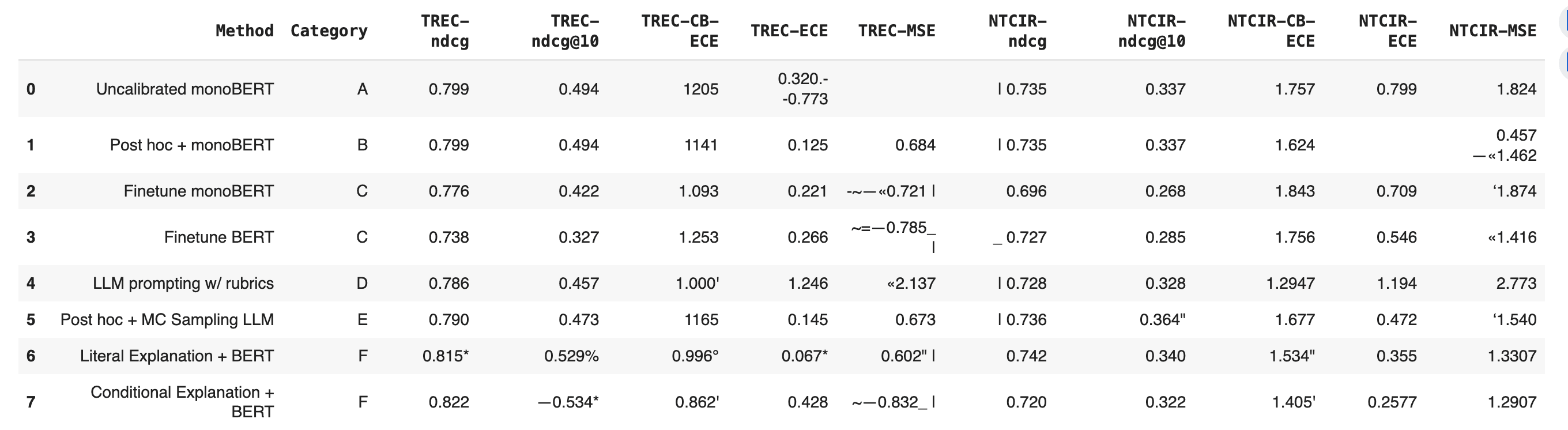Method: Literal Explanation + BERT, Category: F, TREC-ndcg: 0.815*, TREC-ndcg@10: 0.529%, TREC-CB-ECE: 0.996°, TREC-ECE: 0.067*, TREC-MSE: 0.602" |, NTCIR-ndcg: 0.742, NTCIR-ndcg@10: 0.340, NTCIR-CB-ECE: 1.534", NTCIR-ECE: 0.355, NTCIR-MSE: 1.3307