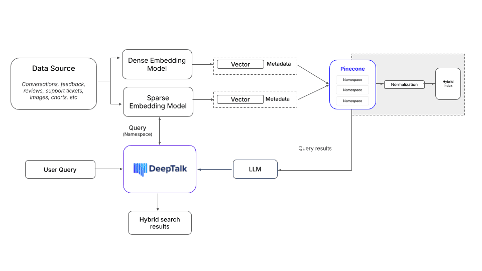 Deep Talk’s healthcare solution showcases how they adapt their technology to meet the unique demands of the industry. By combining Feedback Analysis of physicians satisfaction with an AI Assistant for conversational, evidence-based medicine, they provide a robust tool for healthcare providers. With the help of Pinecone, Deep Talk efficiently stores, manages, and retrieves a wide range of unstructured medical data— from clinical studies and drug labels to patient feedback— ensuring that providers have access to the right information exactly when they need it. Here’s how Pinecone fits into their workflow:
