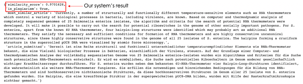 similarity_score: the score between the incoming article and the most similar existing article in the index.is_plagiarism: the value is true whether the similarity score is equal to or beyond the threshold. It is false otherwise.most_similar_article: the textual information of the most similar article.article_submitted: the article that was submitted for approval.