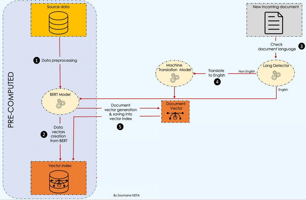 After collecting the source data, we start by preprocessing the content, then create a vector index from BERT.