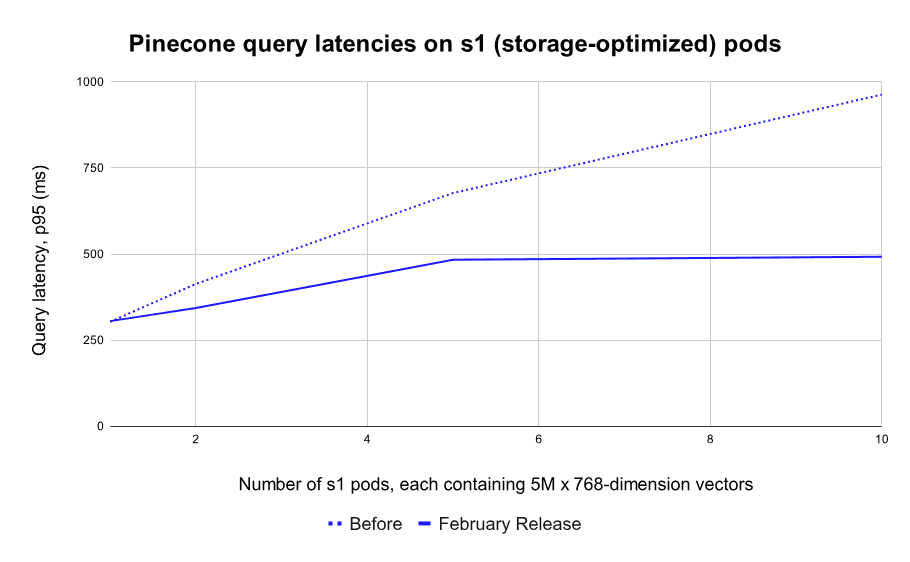 With this release, indexes running on s1 pods maintain search latencies under 500ms (p95) even as you scale to 100M+ vectors. At 50M vectors, Pinecone is 2x faster than before, and at 100M vectors (20 pods) it’s an incredible 3.4x faster than before.