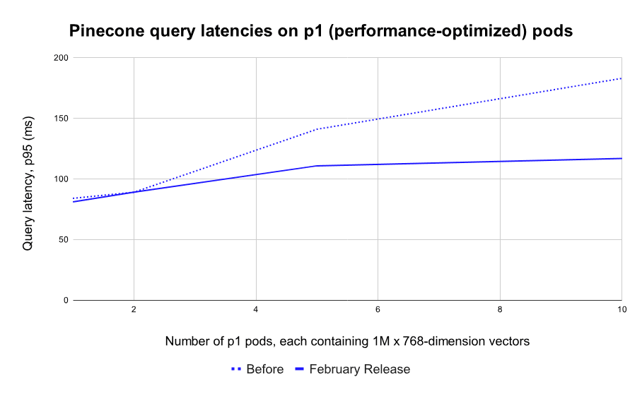 In our benchmark tests, indexes running on our performance-optimized pods (p1) maintain search speeds well below 120ms (p95) as they scale from zero to tens of millions of vectors. At 10M 768-dimensional vectors, Pinecone is now 1.6x faster than before, and at 20M vectors it is a whopping 2.5x faster than before.