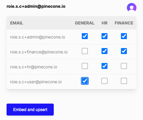 As with other RAG ingestion processes, we iterate over each document, embed it and upsert it into Pinecone. But in our case, we will also associate the document with its category and we’ll create a relationship between the documents and the users in the system, based on the mapping we get from the application.