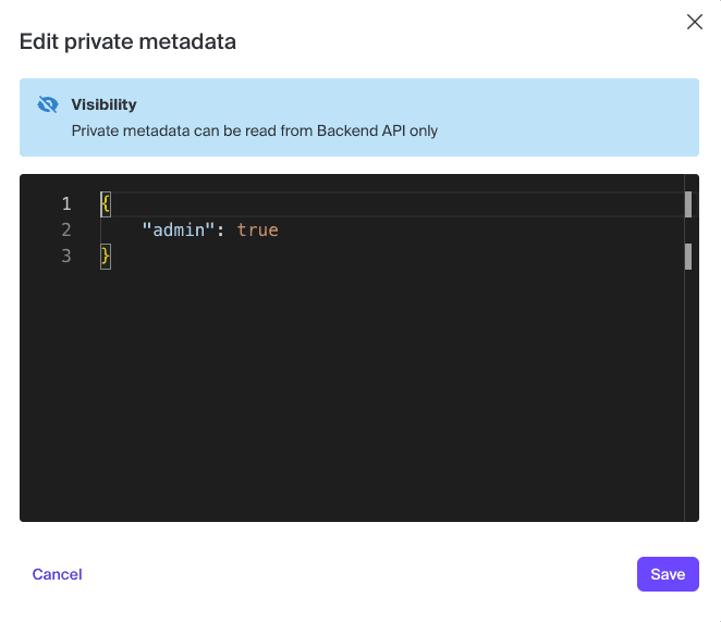 We want to flag the “Admin” user as having some extra permissions here, so we’ll add some private metadata to the user entry: