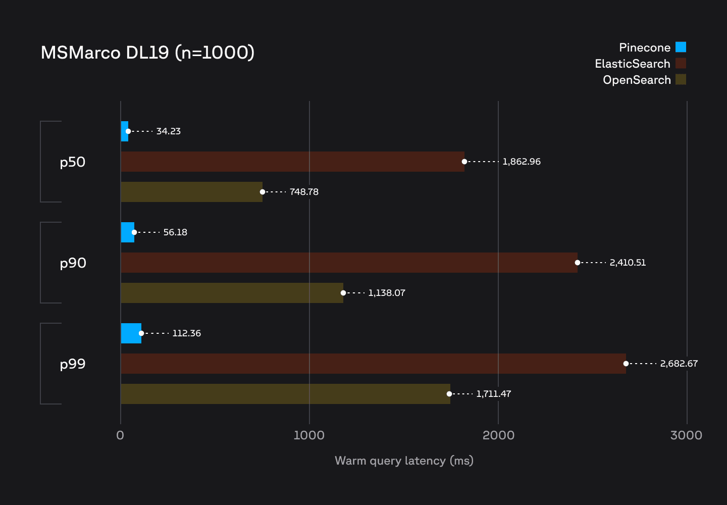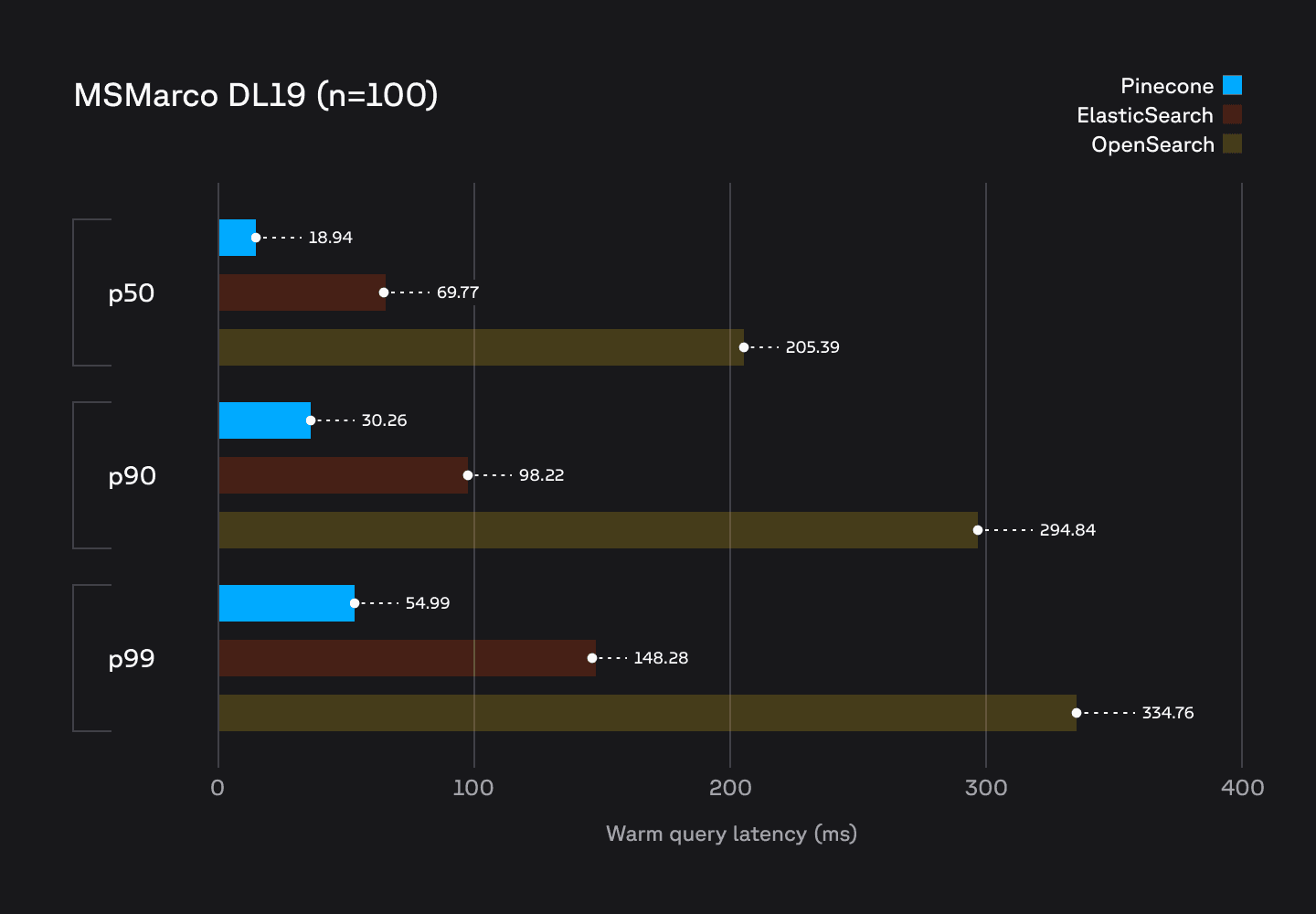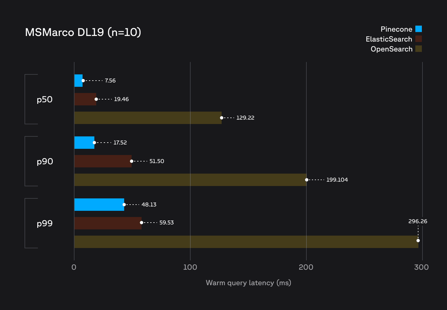 Pinecone's performance for sparse search outperforms existing state-of-the-art search systems such as Elasticsearch and OpenSearch. Using sparse embeddings produced by the pinecone-sparse-english-v0 model for the MS Marco DL19 dataset of 8.9M vectors, we performed the following benchmarks on a single node Elasticsearch cluster, and an OpenSearch cluster running a single r7g.large.search node. We compared these to the newly available Pinecone sparse vector index type running on similar hardware: